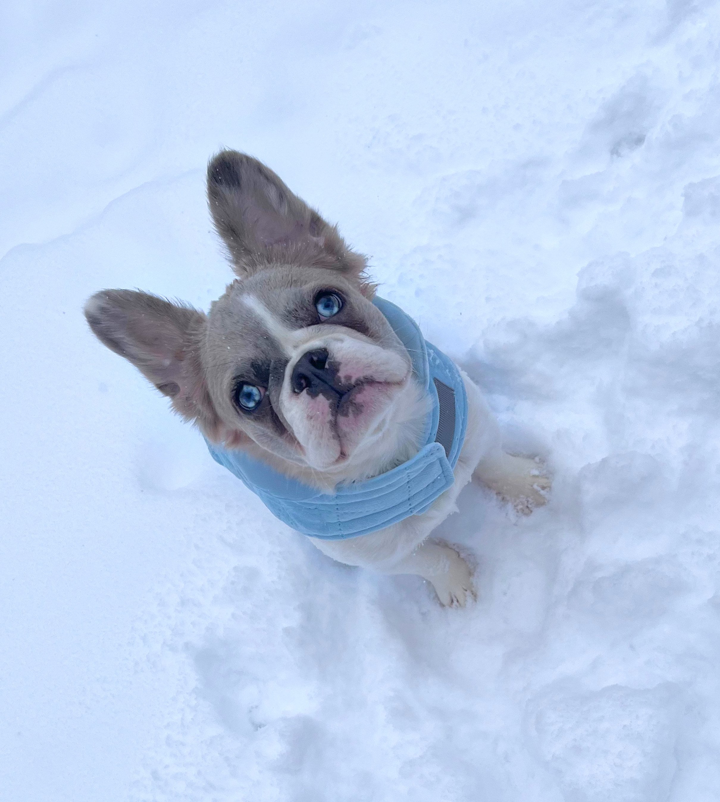 Daisy is the epitome of warmth and charm, a French Bulldog who captures hearts with her striking appearance and her loving, playful nature. With a fluffy coat that boasts a distinctive color and bright blue eyes reminiscent of a little husky, Daisy turns heads wherever she goes.